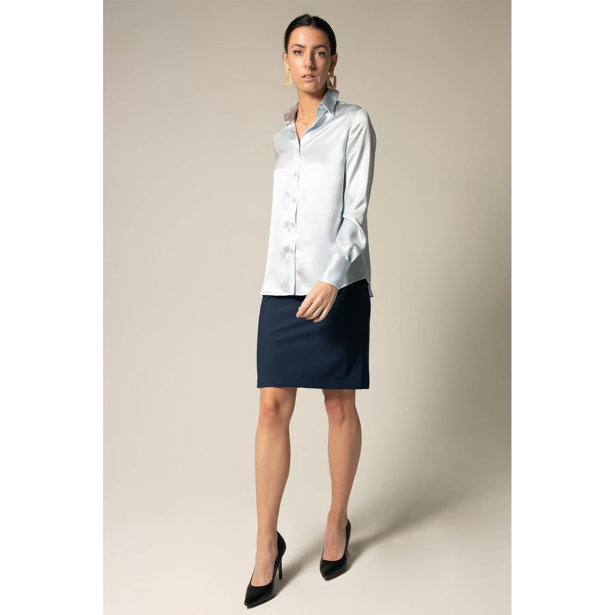 Buy Soft and luxury blue silk shirt from Le Reussi. Tuck in for a formal look or wear it loose for an off-hour look. Style it with bottoms of your choice for a unique look. Â